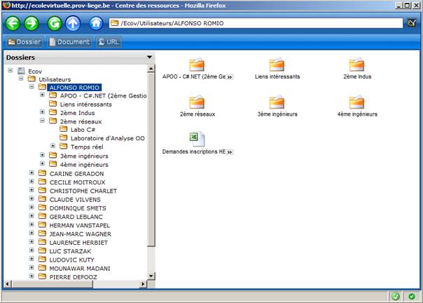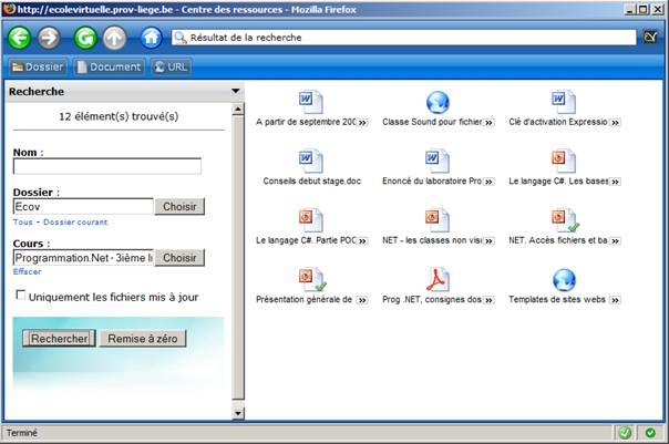 Lorsque, en tant qu'étudiant, vous cliquez sur le lien "Centre des ressources" du menu, vous obtenez :